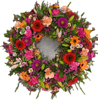 Photo non contractuelle | Couronne colorée Couronne colorée composée de fleurs de saison: roses, lys, gerberas et son magnifique feuillage. Diamètre env. 60 cm