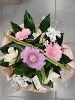 Photo non contractuelle | Gerbe pastel rose et blanche Elégante gerbe piquée fleurs de saison de tonalité rose pastel. Longueur 70 cm env.