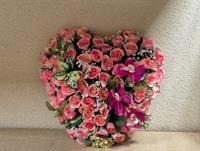 Coeur artificiel roses couleur rose (dimension 40x35) - 1 ruban a choisir parmi notre sélection. avec lien de parenté, d’amitié et de message de regret. (ex: A mon Papa, A notre Ami, Souvenir, etc...)