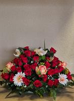 Fleur artificiel composition coussin rouge (dimension 60x60) - 1 ruban a choisir parmi notre sélection. avec lien de parenté, d’amitié et de message de regret. (ex: A mon Papa, A notre Ami, Souvenir, etc...)