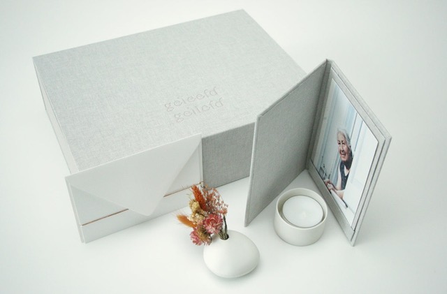| Linnen Koesterdoos Leg samen met collega's, vrienden van familie en schenk de nabestaande deze unieke doos als een verbindende, troostend gebaar. De linnen herinneringsdoos met foliedruk 'geleefd, geliefd' is gevuld met een linnen fotomapje, teder porseleinen theelichthouder, een unieke porseleinen mini-vaasje met droogboeket en een troostkaart 'geliefd'. Warme troostdoos made in Belgium.