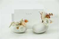 | troostdoosje Twee prachtige porseleinen vaasjes, samen verpakt in een unieke troostdoos. Ze zijn ontroerend in hun zuivere eenvoud en kunnen gebruikt worden voor zowel een droogboeketje als voor een lievelingsbloemetje in te plaatsen. Het vaasje kan water vasthouden. De twee vaasjes worden verpakt in een mooie witte vierkante magneetdoos met boeketjes en een krachtkaartje.