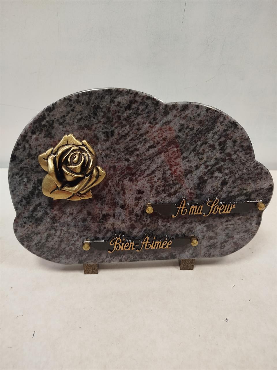 Plaque funéraire en granit avec rose en bronze. Jusqu’à 2 inters de base en bronze possible. Choix à nous communiquer dans la commande dans le champs : "Votre texte à imprimer sur l'article funéraire".