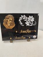 Plaque funéraire avec le Christ. Dimension : 21x15 cm. 1 inter en bronze au choix à nous communiquer au moment de la commande dans le champs : "Votre texte à imprimer sur l'article funéraire" accompagné d'un message si vous souhaitez.