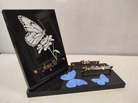 Plaque funéraire en granit avec un papillon gravé en blanc et une fleur en bronze. Dimension : 25x19 cm. 2 inters en bronze au choix à nous communiquer au moment de la commande dans le champs : "Votre texte à imprimer sur l'article funéraire" accompagné d'un message si vous souhaitez.