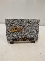 Plaque funéraire avec chasseur gravé en blanc. Dimension : 28x18 cm. 2 inters en bronze au choix à nous communiquer au moment de la commande dans le champs : "Votre texte à imprimer sur l'article funéraire" accompagné d'un message si vous souhaitez.