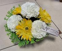 Gerbe composée de fleurs naturelles de saison et accompagnée d'un ruban (si souhaité)