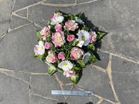Montage floral rond en fleurs artificielles environ 60 cm. Ruban à 5 euros